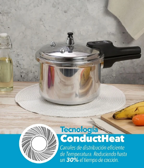 Olla a presión capacidad de 3,2 litros, presión nominal de 72 Kpa, cuerpo en aluminio y tapa en acero Inoxidable, cierre externo, apta para estufas eléctricas y a gas, versátil y fácil de usar.