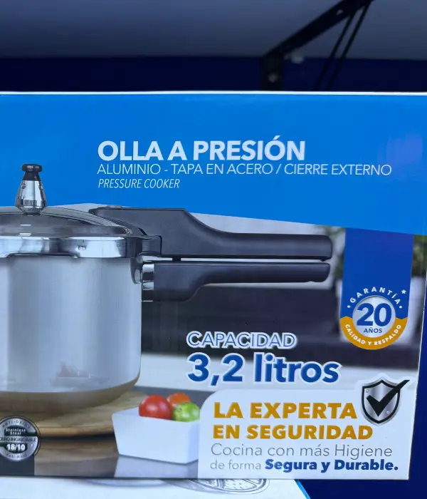 Olla a presión capacidad de 3,2 litros, presión nominal de 72 Kpa, cuerpo en aluminio y tapa en acero Inoxidable, cierre externo, apta para estufas eléctricas y a gas, versátil y fácil de usar.